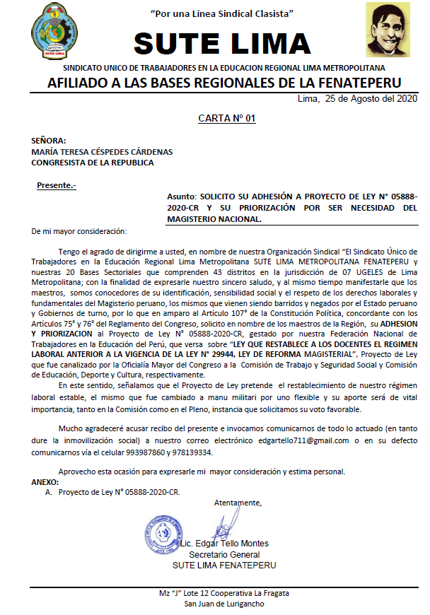 los diferentes sectores de Lima Metropolitana y la Junta directiva del SUTE